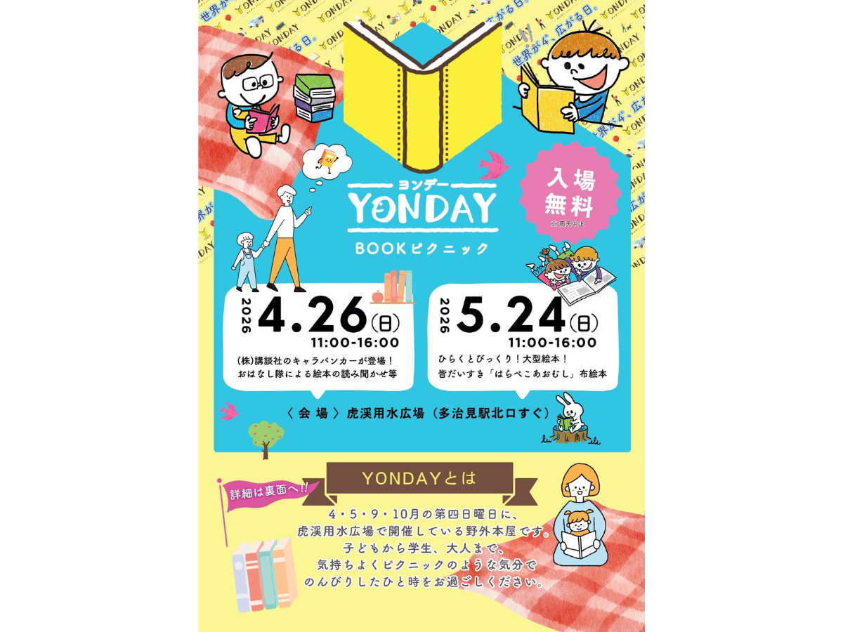 YONDAY BOOK ピクニックは、4.5.9.10月の第4日曜日(SUNDAY)に虎渓用水広場にて開催されている野外本屋です。運営スタッフや来場者が選んだオススメ本を開放的な広場で自由に読んだり、購入する事ができます。カフェや紙芝居の読み聞かせなど、子どもから大人まで、気持ちよく、ピクニックのような気分で過ごせるイベントです。